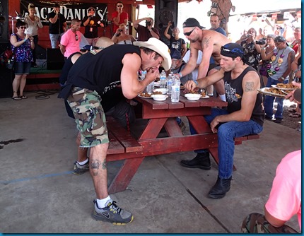 The Rocky mountain oysters (bull testicles) for the ball eating contest and the contest. They got 4 minutes to eat as many oysters as they could. Heaving disqualified you. The guy in the camo shorts on the end won. He ate almost 3 plates worth and he looked a little green afterwards.