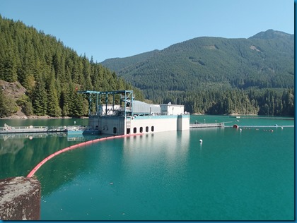 View of Baker from the top of Upper Baker dam. This contraption is behind the dam. We are not sure what it is, but think it is part of the save the salmon, they catch all the salmon that are going back to the ocean, put them in trucks-fish taxis and take them past the two dams and the hydroelectrics and put them in the Skagit river.