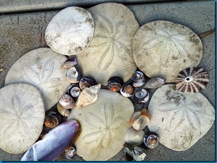 I picked up these shells at Hobuck beach near Cape Flattery up north. Sand dollars the size of my hands. Lots of colorful small shells for baskets. I love sand dollars, I just can walk by them on the beach without picking them up.