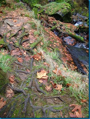 Here is an old photo of them widening the road. It is 200 feet straight down from here. They took lumber from a saw mill above the falls down this road during WWII. The road was maintained until 1956 when the last homesteaders moved out. Some twisted roots at the bottom of Silver falls.