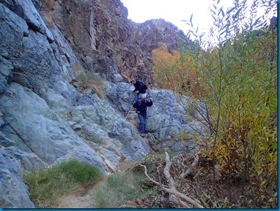 Further up the canyon. Something you don’t see too often in the desert, trees, water and water falls. John is photographing a small waterfall as Judy passes him.