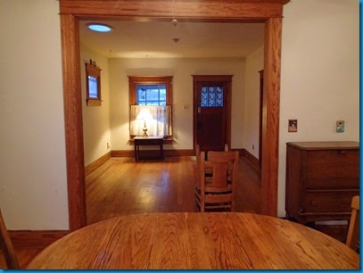 The living room and dining room. All of the woodwork is fir and has never been painted. I had the carpets taken up and the floors refinished. Stained glass in the front door and window on the left.