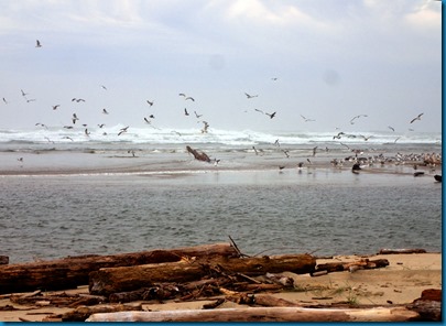 My boat beached in the estuary by the ocean. Lots and lots of birds at the confluence. Huge waves too. We had our lunch here.