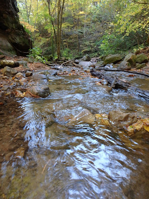 The view down the south side of the bluff. Some trees are starting to turn. Hickory nuts, pot holes in the rocks and the sign for the East Bluff Trail- you can even ski here! And some brave soul, there is a big drop off this bluff.