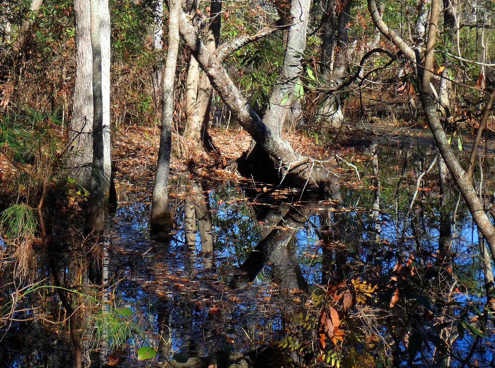 It was in the 60's, sunny and beautiful. We went to Nag's Head Woods Preserve and hiked 5 miles. The conservancy's office is on this pond covered with green duck weed. We hiked the Sweet gum swamp trail-which is designed for adventurous hikers. It climbs several steep dune ridges and leads through a variety of of plant communities and around numerous ponds. The colors were wonderful.