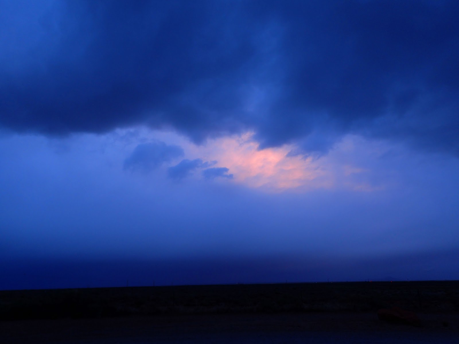 Meanwhile back at the bus we have 30 mph winds with 40 mph gusts and some showers. I didn't think there would be a sunset because of the dark clouds, but we got this weird mini sunset. We moved down the road about 30 miles to Homolovi State Park. There are indian ruins here. It was very windy, with some showers. Here we are in our campsite.