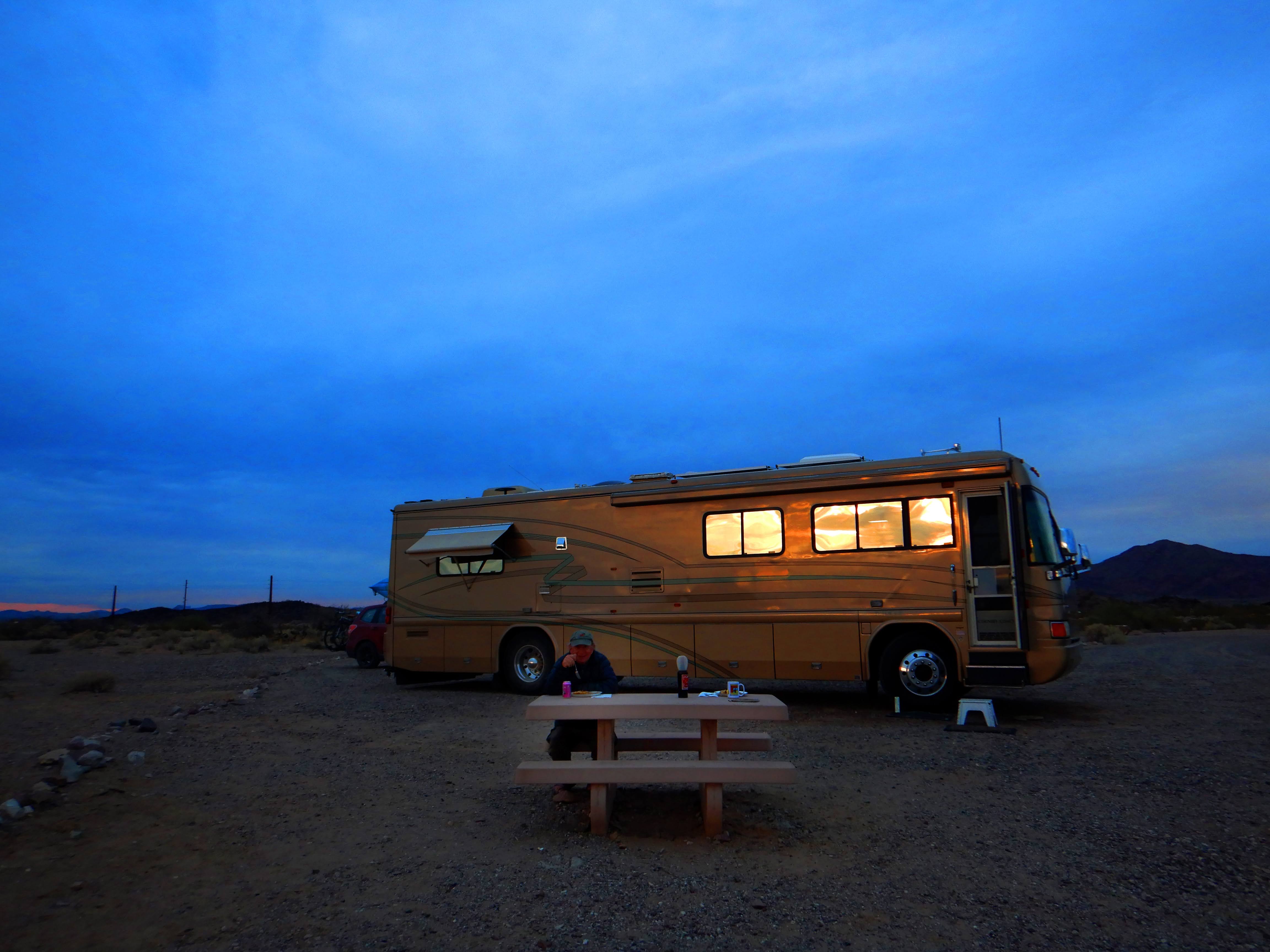 It was cloudy most of the day, but 70 degrees. Dinner on our picnic table in our campsite at Painted Rocks Campground during a brief glimpse of sunset. We had a small spot of sunset tonight.