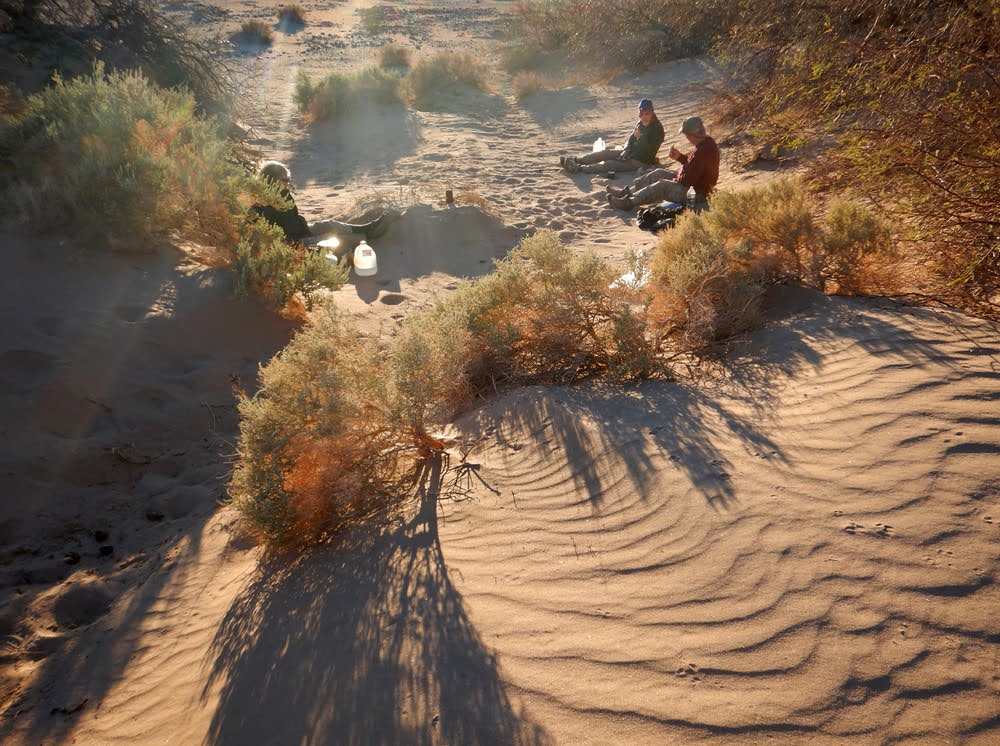 I finished the masterpiece. It is made from natural and dyed pine needles, birch bark, glass, metal and bone beads. We went to Badwater to pick up Judy and Judy finishing coming inon their final sttetch from Beatty to Badwater, 170 mile 2 week hike. Bec and I hiked out to meet them. They are the two tiny dots in the middle of the salt flat.